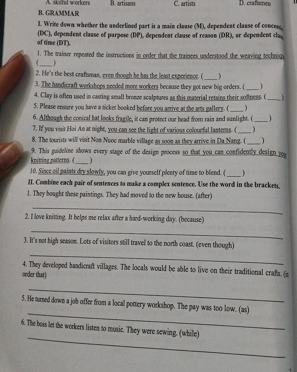 I. Write down whether the underlined part is a main clause (M), dependent clause of concessi