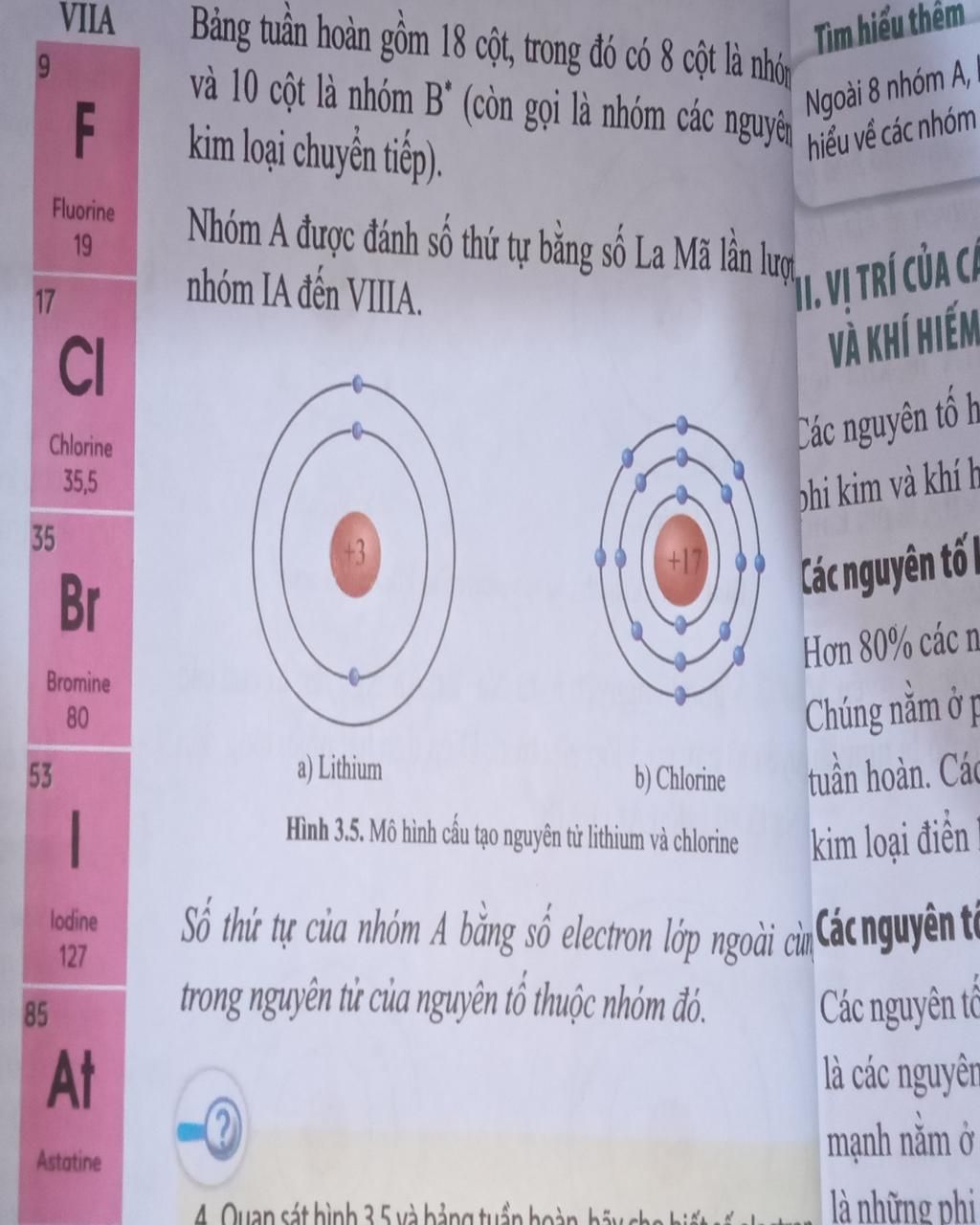 Quan sát H3.5 và bảng tuần hoàn, hãy cho biết số electron lớp ngoài cùng của nguyên tử Li và Cl. Hai nguyên tố đó nằm ở nhóm nào trong bảng tuần hoàn? Từ đó nhận xét số thứ tự của nhóm a và số e lớp ngoài cùng ?