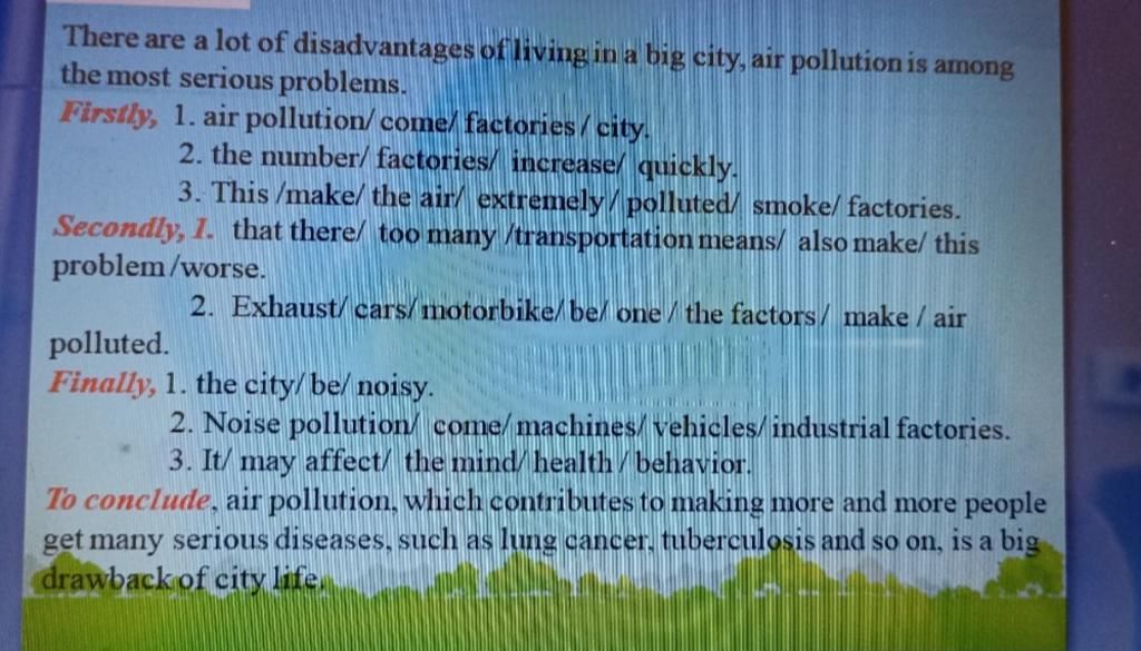 Firstly, 1. air pollution/ come/ factories/city.