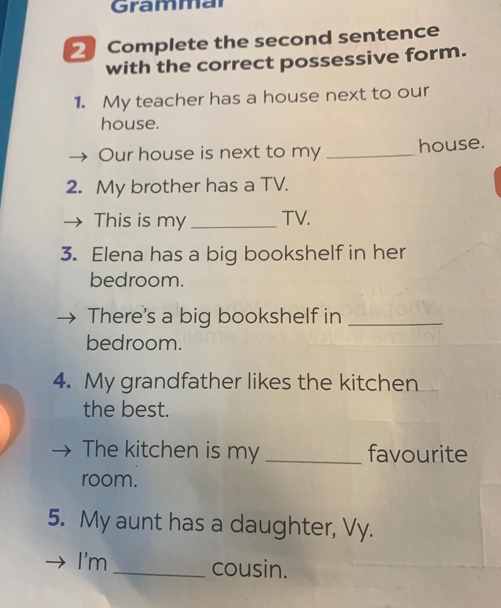 1. My teacher has a house next to our house. ( (Giáo viên của tôi có một ngôi nhà cạnh nhà của chúng tôi.)