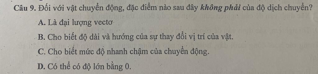 `=>` `C` sai vì mức độ nhanh hay chậm của chuyển động ta dựa vào vận tốc , tốc độ của vật , chứ không dựa vào độ dịch chuyển.