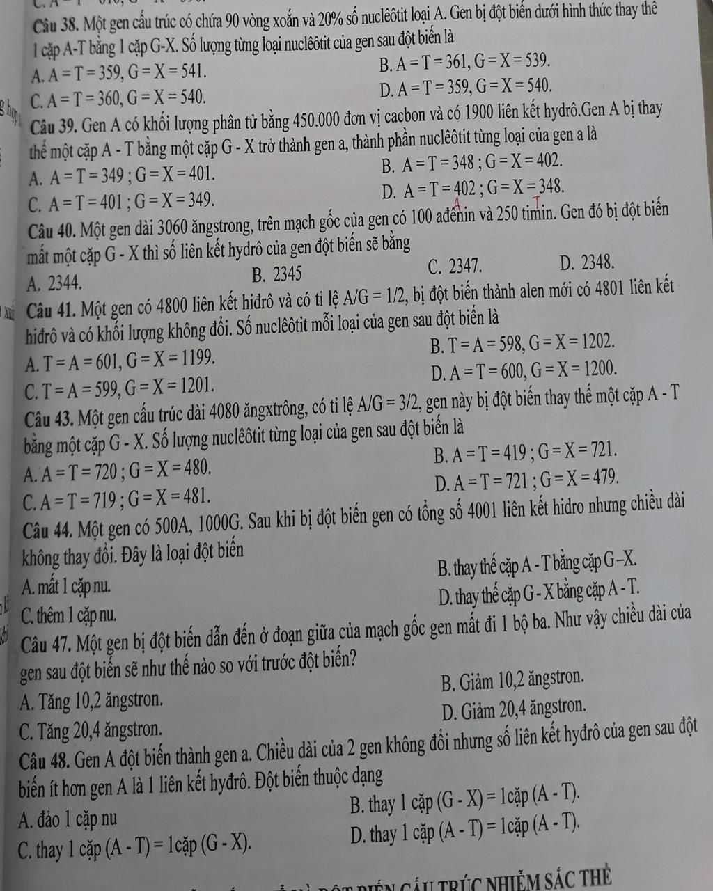 `⇒ B.` thay thế `1` cặp `G - X = 1` cặp `A - T`