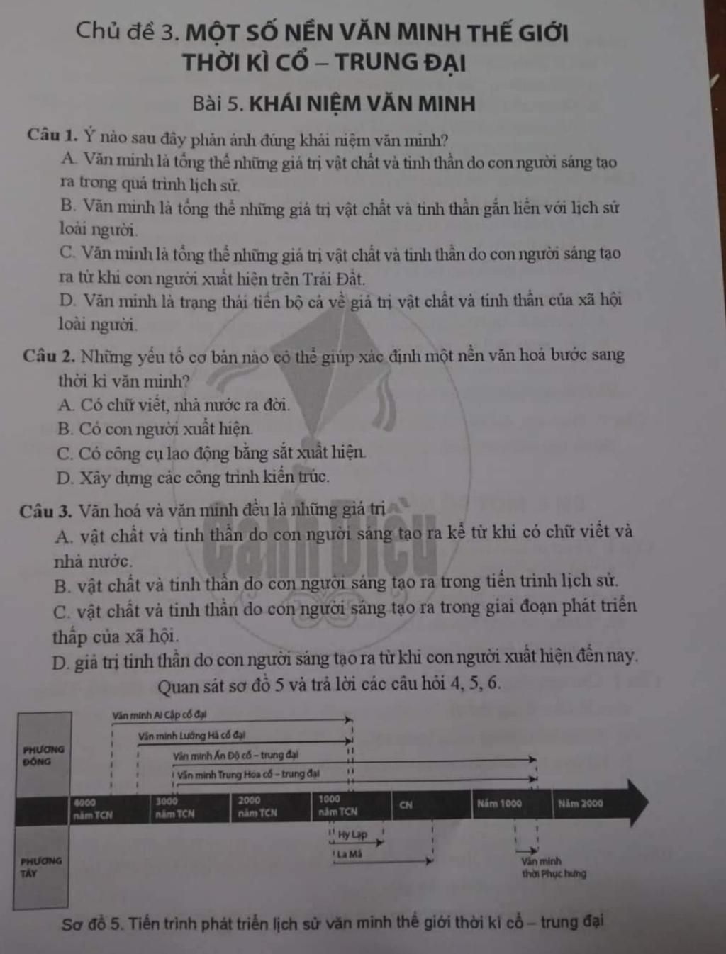 Câu `1->`D. Văn minh là trạng thái tiến bộ cả về giá trị vật chất và tinh thần của xã hội loài người`.`