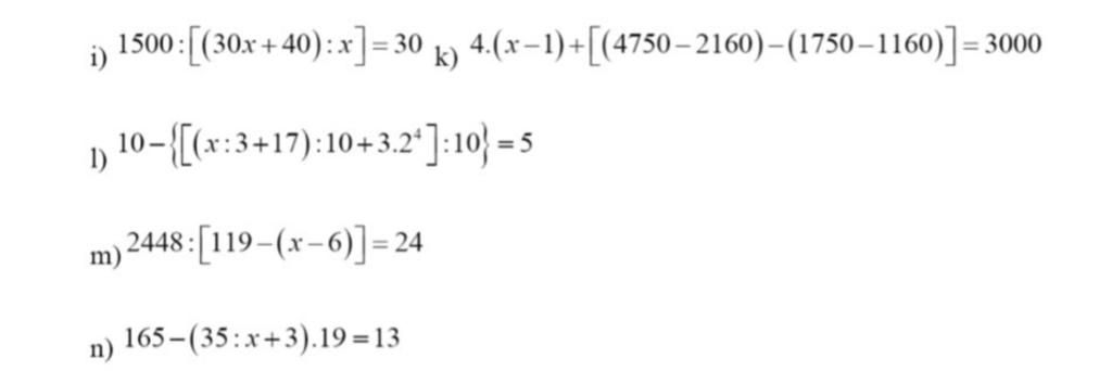 l) `10 - {[( x : 3 + 17 ) : 10 + 3.2^4] : 10 } = 5`