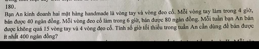 Để thời gian làm là ngắn nhất thì bạn An cần bán 2 vòng tay và 4 vòng đeo cổ