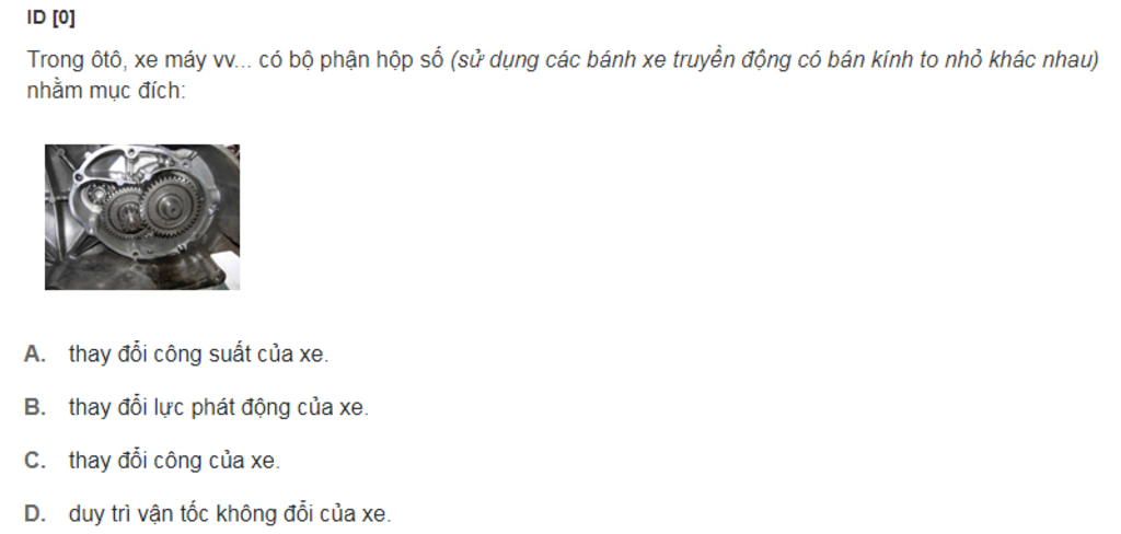 Hay nói 1 cách đơn giản hơn là hộp số nhằm điều chỉnh vận tốc tăng giảm làm cho độ lớn của lực thay đổi giúp xe có thể đi được ở những đoạn đường khác nhau (khó đi - có ma sát lớn, dễ đi - có ma sát nhỏ).