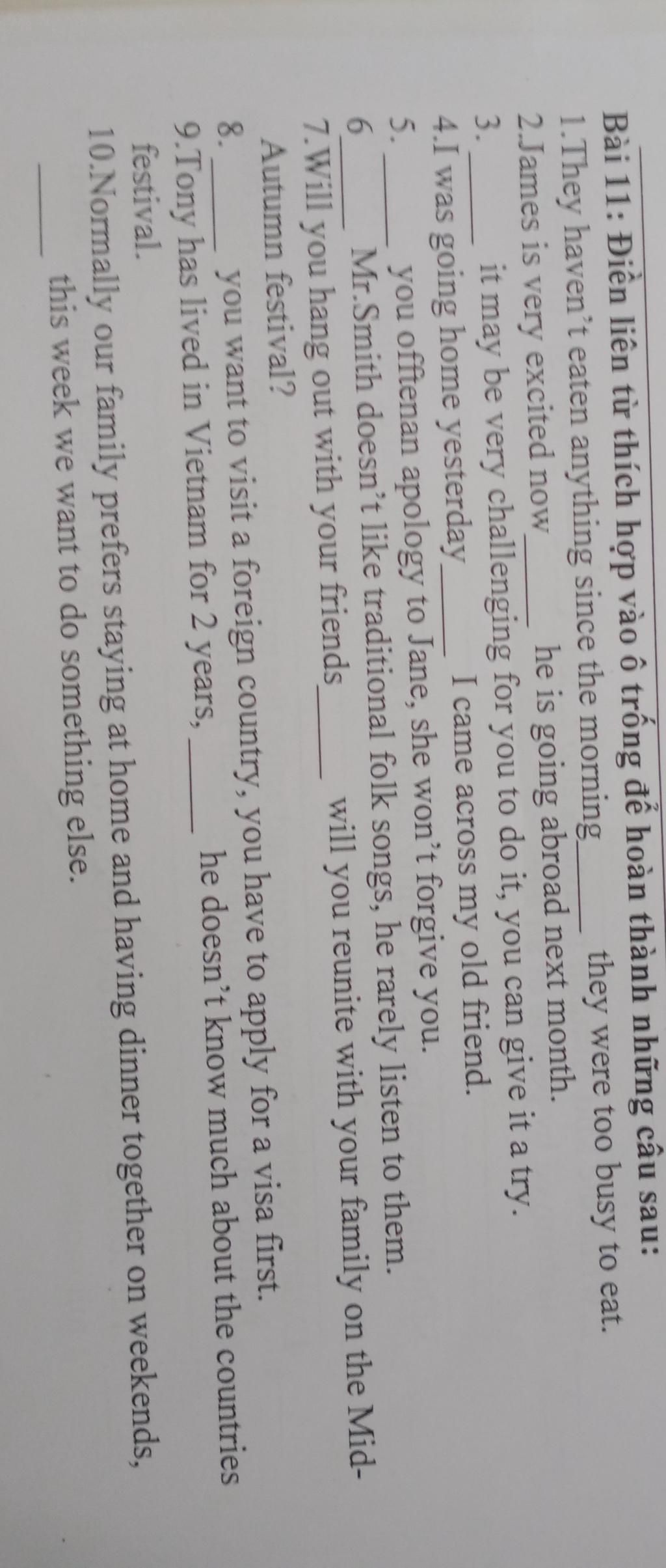 Bài 11: Điền liên từ thích hợp vào ô trống để hoàn thành những câu sau: