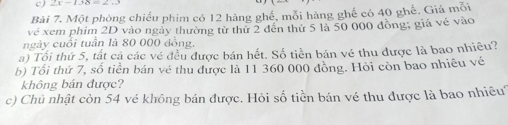 Bài 7. Một phòng chiếu phim có 12 hàng ghế, mỗi hàng ghế có 40 ghế. Giá mỗi