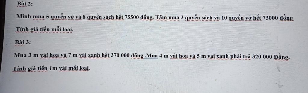 Minh mua 5 quyển vở và 8 quyển sách hết 75500 đồng. Tâm mua 3 quyển sách và 10 quyển vở hết 73000 đồng