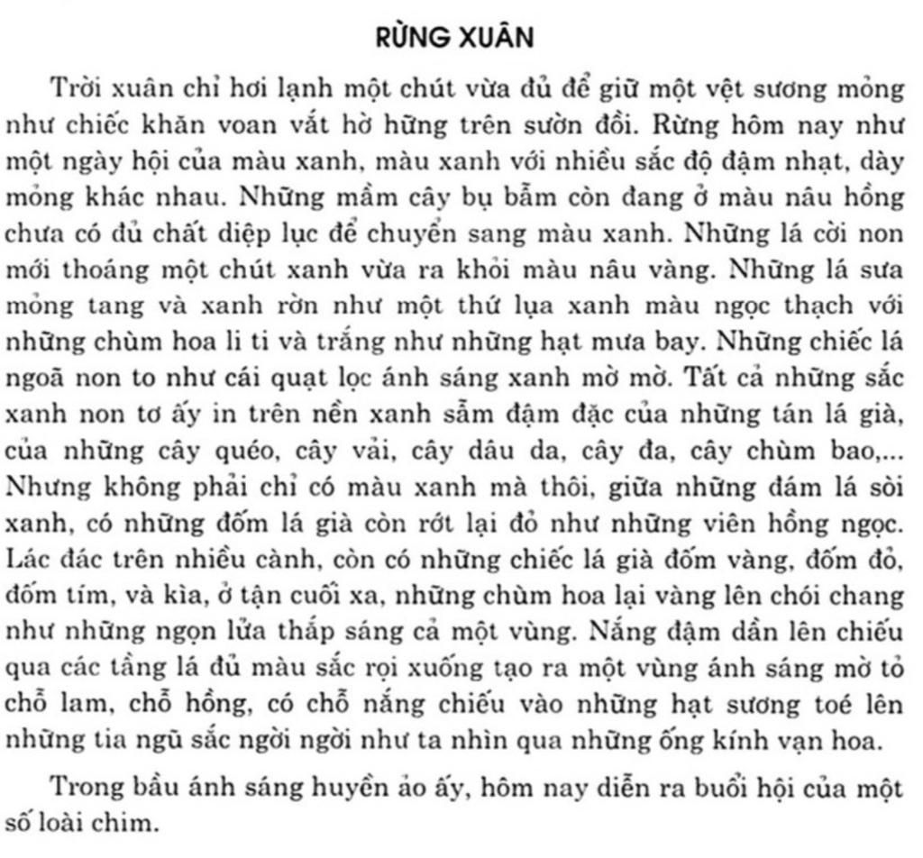 ⇒ Đó là sự hoà quyện của cảnh vật, của thiên nhiên cùng với cảm xúc của tác giả. Bằng hình ảnh so sánh, tác giả cho em thấy những màu sắc của thiên nhiên như đang biến đổi không ngừng, tạo nên một vùng không gian lung linh huyền ảo giống như ta đang nhìn qua ống kính vạn hoa. Cây cối đâm chồi nảy lộc và đua nhau khoe sắc. Em thấy cảnh vật thiên nhiên của rừng xuân thật đáng yêu !