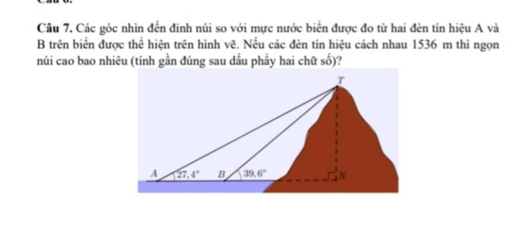 Câu 7. Các góc nhìn đến đỉnh núi so với mực nước biển được đo từ hai đèn tín hiệu A và