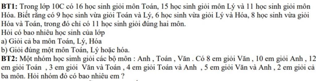 BT1: Trong lớp 10C có 16 học sinh giỏi môn Toán, 15 học sinh giỏi môn Lý và 11 học sinh giỏi môn