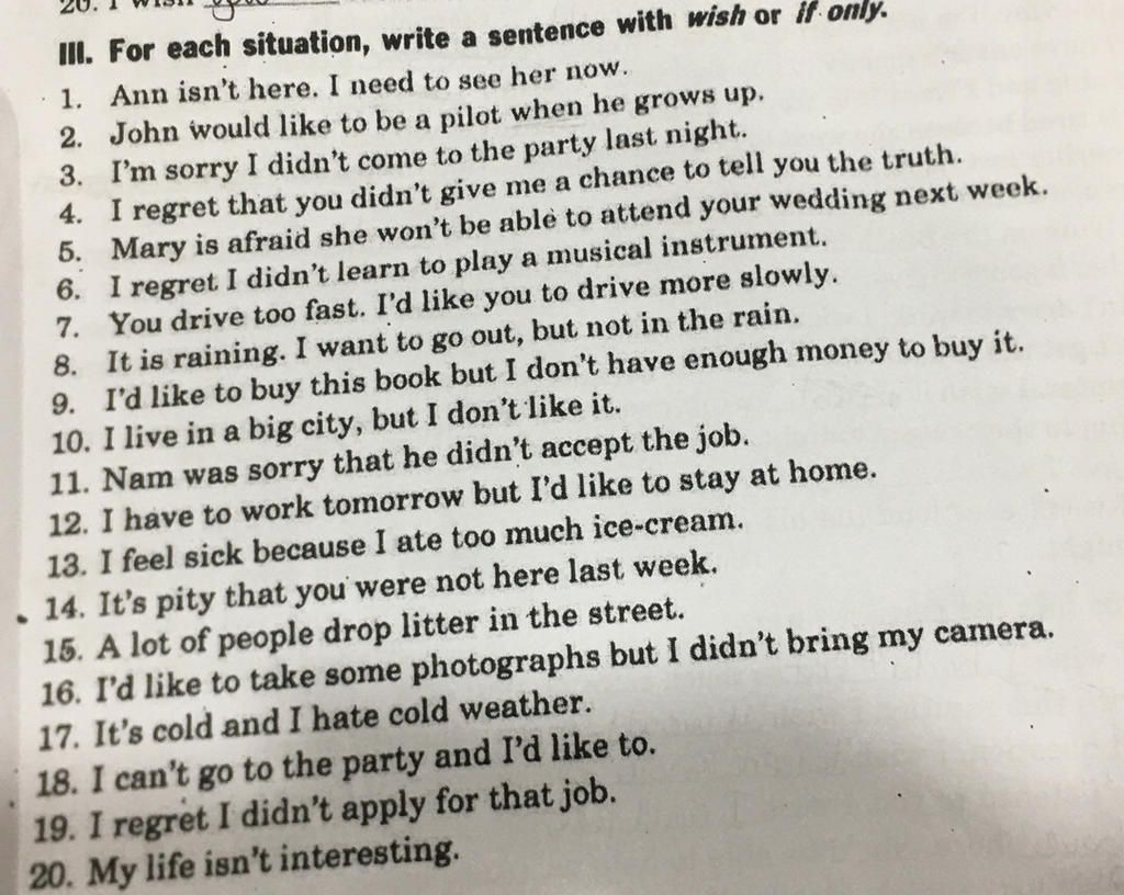 III. For each situation, write a sentence with wish or if only.