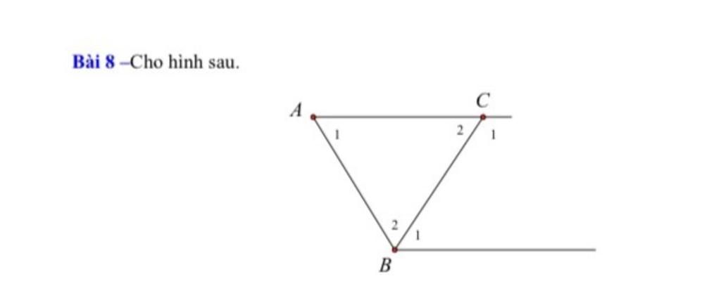 $b)$ Các góc so le trong tại $\widehat{C}$ và $\widehat{B}$ là: $\widehat{C_2}$ và $\widehat{B_1}$ ; $\widehat{C_1}$ và $\widehat{B_2}$