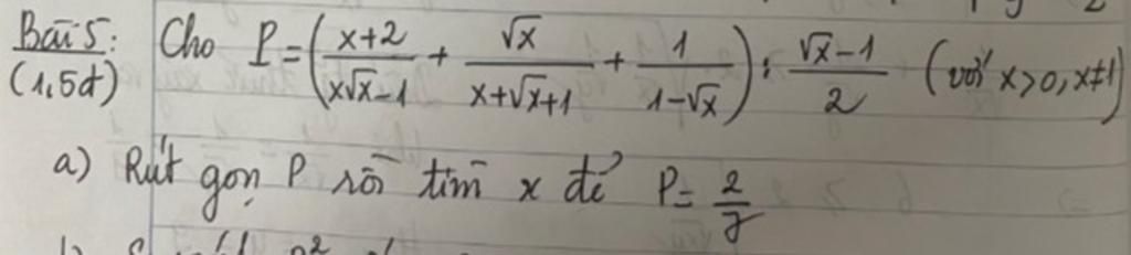P = \left( {\dfrac{{x + 2}}{{x\sqrt x - 1}} + \dfrac{{\sqrt x }}{{x + \sqrt x + 1}} + \dfrac{1}{{1 - \sqrt x }}} \right):\dfrac{{\sqrt x - 1}}{2}\\