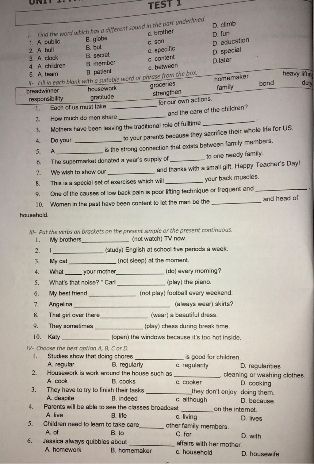 1- Find the word which has a different sound in the part underlined.