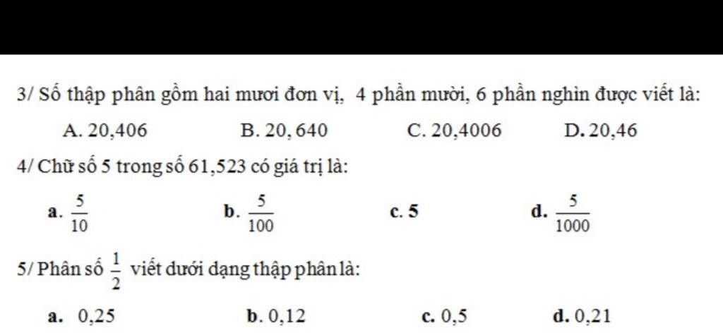 Số 5 nằm ở hàng phần mười nên có giá trị là `5/10`