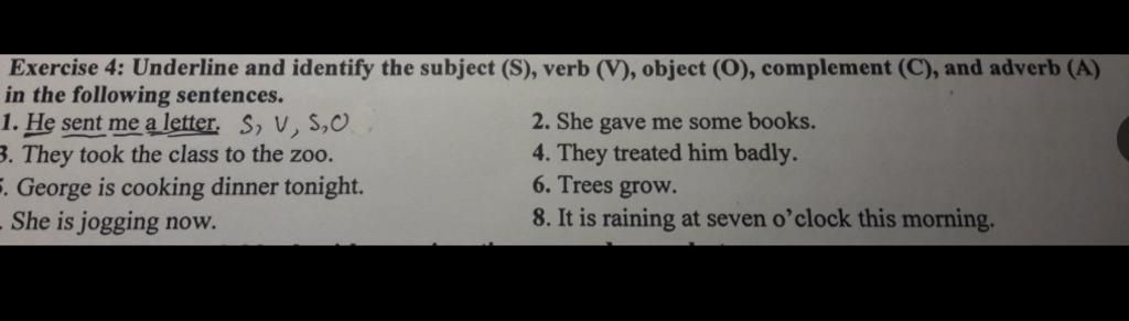 Exercise 4: Underline and identify the subject (S), verb (V), object (O), complement (C), and adverb (A)