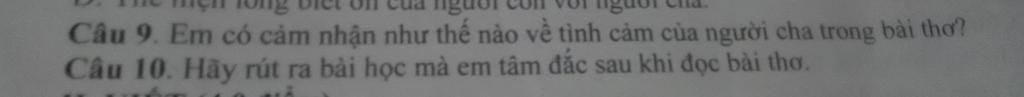 Câu `9.` Tôi cảm nhận được tình cảm của người cha dành cho con rất sâu ắc và ấm áp. Người cha luôn quan tâm, yêu thương và mong con học hành nên người. Tình cảm ấy tuy giản dị nhưng vô cùng thiêng liêng và cảm động.