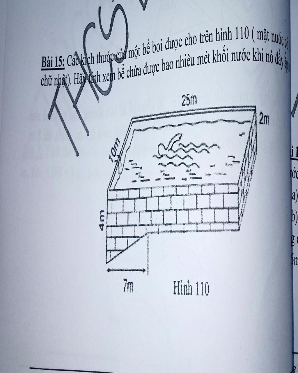 Các kích thước của một bể bơi được cho (mặt nước có dạng hình chữ nhật ) . Hãy tính xem bể chứa được bao nhiêu mét khối nước khi nó đầy ắp nước?