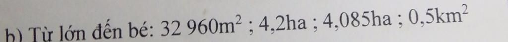`=>` Nên `0,5km^2 > 4,2ha > 4,085ha > 32 960m^2`