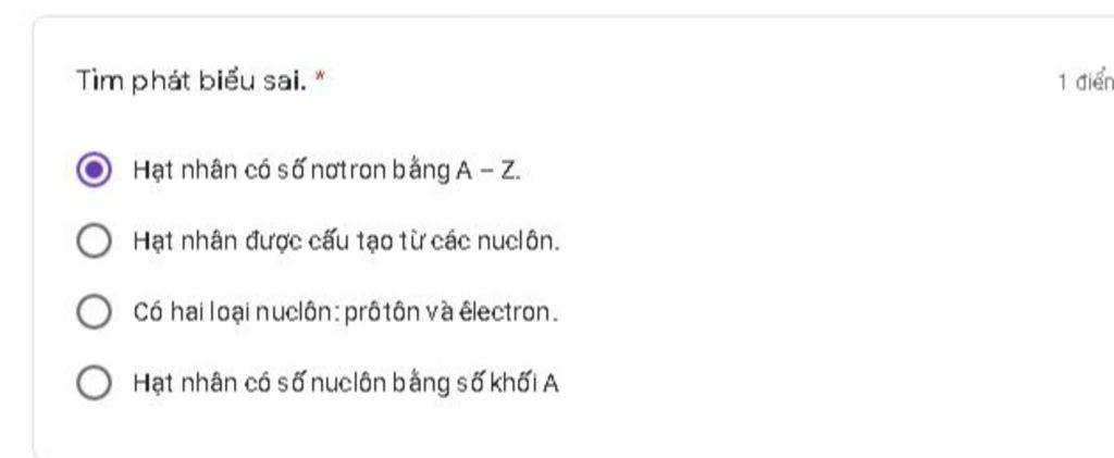 `@` Sai`:`Có hai loại nuclôn`text(: proton và electron.`