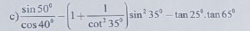 $c) \dfrac{\sin 50^\circ}{\cos 40^\circ}-\left(1+\dfrac{1}{\cot^235^\circ}\right) \sin^2 35^\circ-\tan 25^\circ.\tan 65^\circ\\ =\dfrac{\cos(90^\circ- 50^\circ)}{\cos 40^\circ}-\left(1+\dfrac{1}{\dfrac{\cos^235^\circ}{\sin^235^\circ}}\right) \sin^2 35^\circ-\tan 25^\circ.\cot(90^\circ- 65^\circ)\\ =\dfrac{\cos 40^\circ}{\cos 40^\circ}-\left(1+\dfrac{\sin^235^\circ}{\cos^235^\circ}\right) \sin^2 35^\circ-\tan 25^\circ.\cot 25^\circ\\ =1-\dfrac{\cos^235^\circ+\sin^235^\circ}{\cos^235^\circ}. \sin^2 35^\circ-1\\ =-\dfrac{1}{\cos^235^\circ}. \sin^2 35^\circ\\ =-\dfrac{ \sin^2 35^\circ}{\cos^235^\circ}\\ =-\tan^2 35^\circ .$