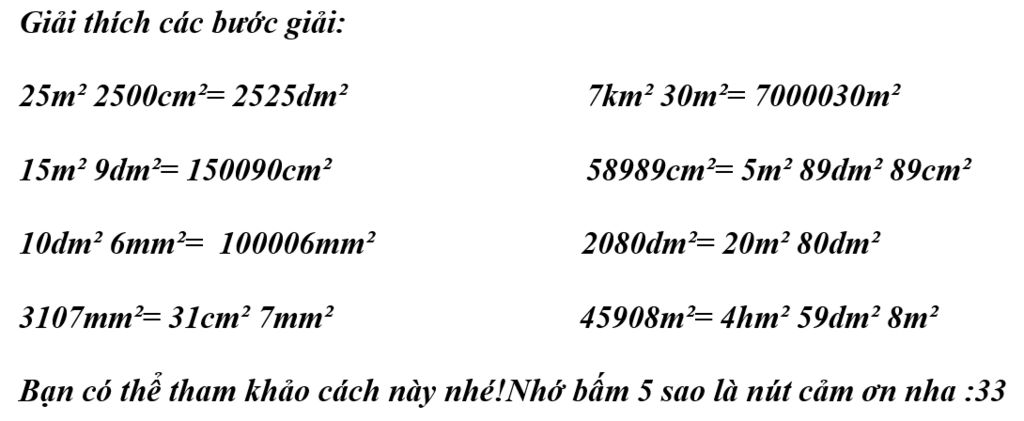$25m^2 2500cm^2\\ =25m^2 + 2500cm^2\\ =2500dm^2 + 25dm^2\\ = 2525dm^2\\ 15m^2 9dm^2\\ =15m^2+ 9dm^2\\ =150000cm^2+ 900cm^2\\ = 150900cm^2\\ 10dm^2 6mm^2\\ =10dm^2 +6mm^2\\ =100000mm^2 +6mm^2\\ =100006mm^2\\ 7km^2 30m^2\\ =7km^2 +30m^2\\ =7000000km^2 +30m^2\\ = 7000030m^2\\ 58989cm^2\\ =50000cm^2+8900cm^2+89cm^2\\ =5m^2+89dm^2+89cm^2\\ =5m^289dm^289cm^2\\ 2080dm^2\\ =2000dm^2+80dm^2\\ =20m^2+80dm^2\\ = 20m^280dm^2\\ 3107mm^2\\ =3100mm^2+7mm^2\\ =31cm^2+7mm^2\\ =31cm^27mm^2\\ 45908m^2\\ =40000m^2+5900m^2+8m^2\\ =4hm^2+59dam^2+8m^2\\ =4hm^259dam^28m^2.$