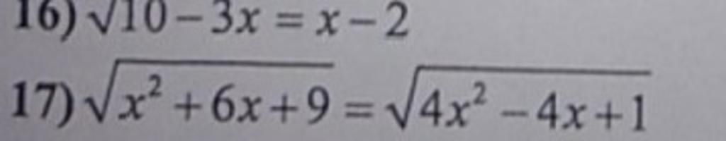 17) `sqrt{x^2 + 6x + 9}` `=` `sqrt{4x^2 - 4x + 1}`