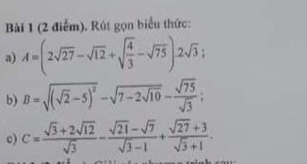 $\begin{array}{l} a)A = \left( {2\sqrt {27} - \sqrt {12} + \sqrt {\dfrac{4}{3}} - \sqrt {75} } \right).2\sqrt 3 \\ = 36 - 12 + 4 - 30\\ = - 2\\ b)B = \sqrt {{{\left( {\sqrt 2 - 5} \right)}^2}} - \sqrt {7 - 2\sqrt {10} } - \dfrac{{\sqrt {75} }}{{\sqrt 3 }}\\ = \left| {\sqrt 2 - 5} \right| - \sqrt {5 - 2.\sqrt 5 .\sqrt 2 + 2} - \sqrt {\dfrac{{75}}{3}} \\ = 5 - \sqrt 2 - \sqrt {{{\left( {\sqrt 5 - \sqrt 2 } \right)}^2}} - \sqrt {25} \\ = 5 - \sqrt 2 - \sqrt 5 + \sqrt 2 - 5\\ = - \sqrt 5 \\ c)C = \dfrac{{\sqrt 3 + 2\sqrt {12} }}{{\sqrt 3 }} - \dfrac{{\sqrt {21} - \sqrt 7 }}{{\sqrt 3 - 1}} + \dfrac{{\sqrt {27} + 3}}{{\sqrt 3 + 1}}\\ = \dfrac{{\sqrt 3 + 4\sqrt 3 }}{{\sqrt 3 }} - \dfrac{{\sqrt 7 \left( {\sqrt 3 - 1} \right)}}{{\sqrt 3 - 1}} + \dfrac{{3\sqrt 3 + 3}}{{\sqrt 3 + 1}}\\ = \dfrac{{5\sqrt 3 }}{{\sqrt 3 }} - \dfrac{{\sqrt 7 \left( {\sqrt 3 - 1} \right)}}{{\sqrt 3 - 1}} + \dfrac{{3\left( {\sqrt 3 + 1} \right)}}{{\sqrt 3 + 1}}\\ = 5 - \sqrt 7 + 3\\ = 8 - \sqrt 7 \end{array}$
