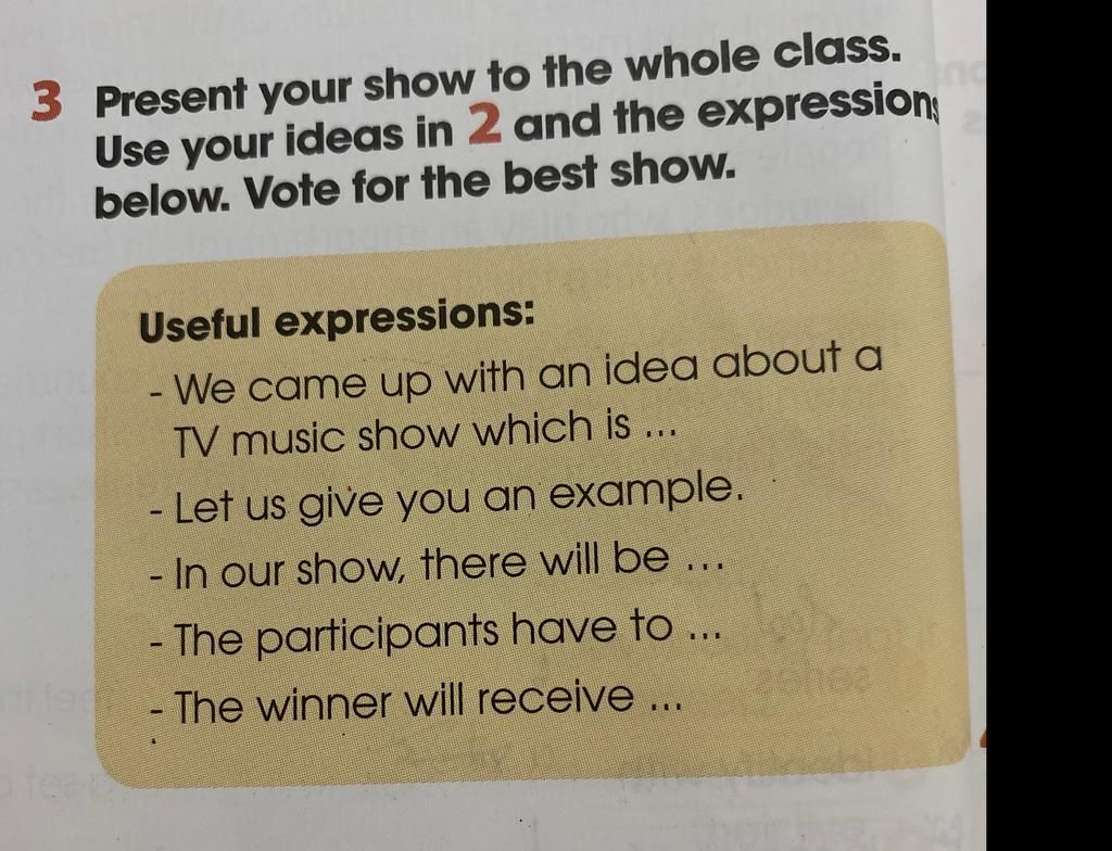 => We proposed an idea for I've got the Rhythm, a TV music show. Let us take an example. Our show will introduce five contestants, three main jedges, and a well-known local singer. The singer and the judges will assign a score for each contestant. The five contestants must take turns performing a song with a different rhythm from the original. The winner is the person who sings the most correctly and beautifully, and he or she will receive a prize as well as a trip to Canada.