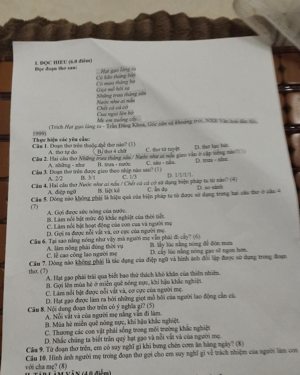 Câu 3: Đoạn theo trên được gieo theo nhịp nào sau?