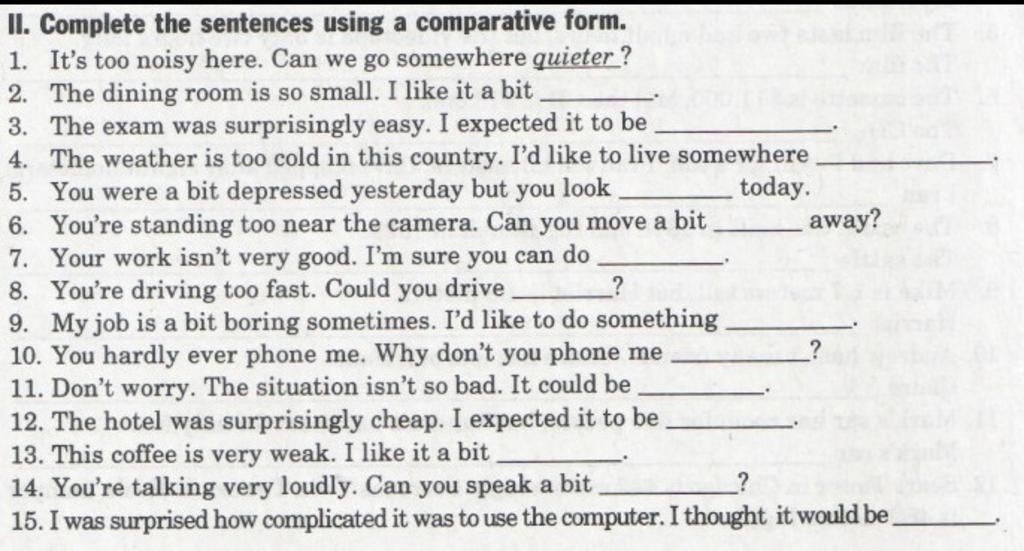 II. complete the sentences using a comparative form 1. It's too noisy here. Can we go somewhere quieter? 2. the dining room is so small. I like it a bit 3. The exam was surprisingly easy. I expected it to be 4. The weather is too cold in this country. I'd like to live somewhere