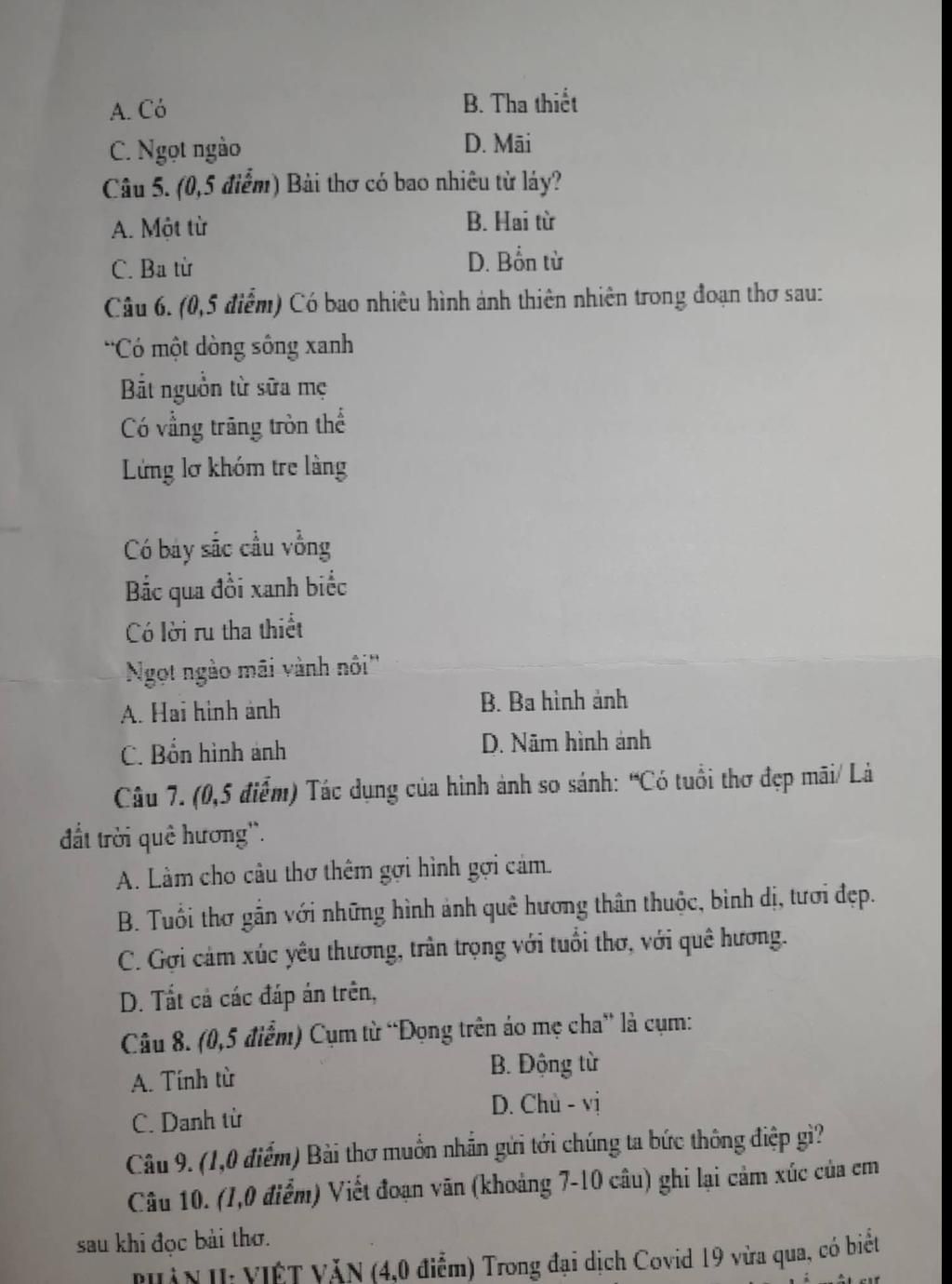 Câu 5. (0,5 điểm) Bài thơ có bao nhiêu từ láy?
