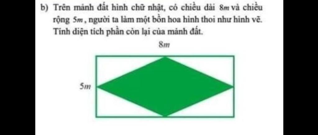 Diện tích phần đất còn lại là [Với S mảnh đất hình chữ nhật và S bồn hoa hình thi thì ta tính S phần đất còn lại bằng cách lấy S mảnh đất hình chữ nhật - S bồn hoa hình thoi]