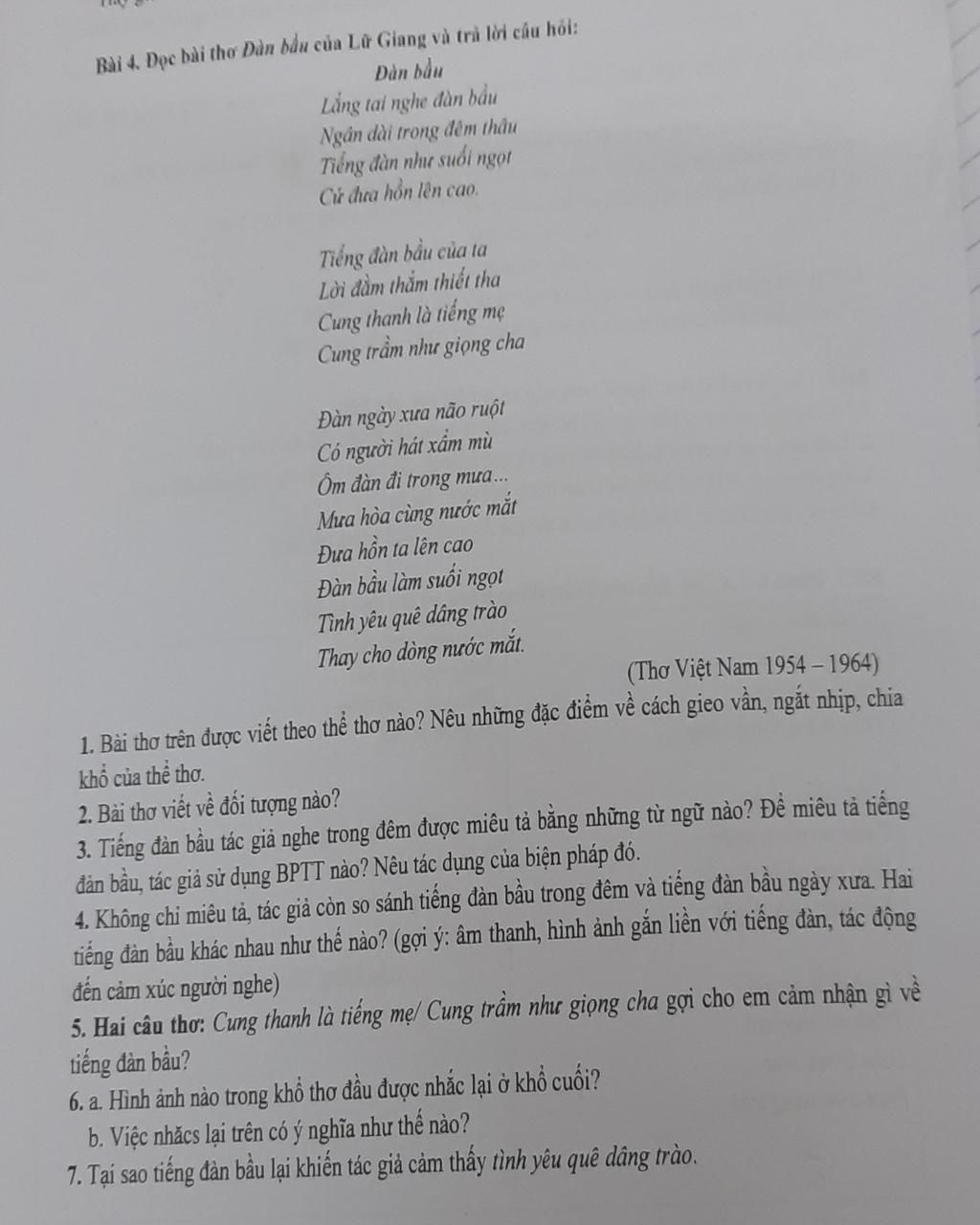 Bài 4. Đọc bài thơ Đàn bầu của Lữ Giang và trả lời câu hỏi: