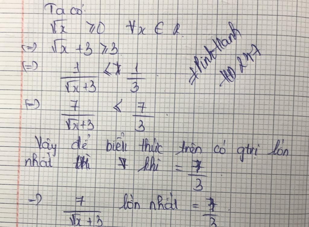 Vậy GTLN của `7/(sqrt{x} + 3` là `7/3` khi `x=0`
