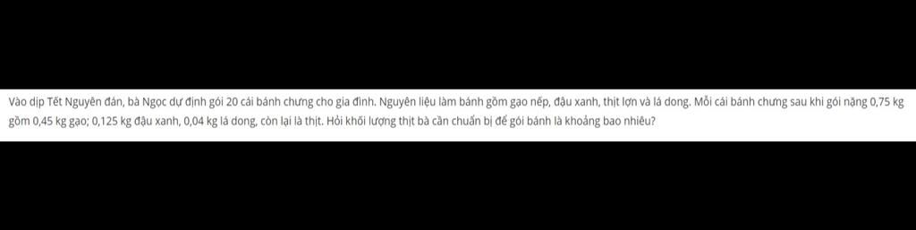 Đáp án: 2 , 7 ( k g ) Giải thích các bước giải: Khối lượng thịt 1 cái bánh chưng là: 0 , 75 − ( 0 , 45 + 0 , 125 + 0 , 04 ) = 0 , 135 ( k g ) Khối lượng thịt bà Ngọc dư định để gói là: 0 , 135 ⋅ 20 = 2 , 7 ( k g )