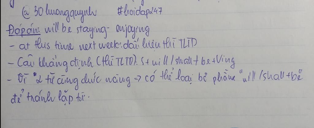 `->` Dấu hiệu nhận biết là mốc thời gian cụ thể "this time this week" `->` chia thì tương lai tiếp diễn.