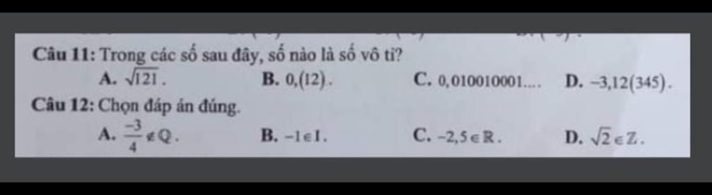 `C.0,010010001=>` Số vô tỉ vì đây ko phải số thập phân vô hạn tuần hoàn hay số thập phân hữu hạn