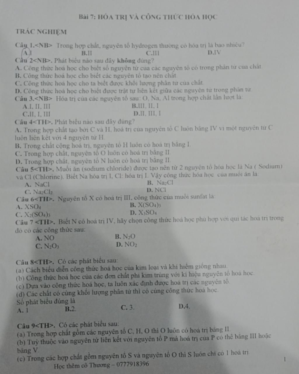 Câu I. Trong hợp chất, nguyên tố hydrogen thường có hóa trị là bao nhiêu?