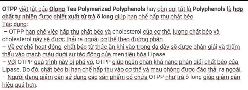 OTPP viết tắt của Olong Tea Polymerized Polyphenols hay còn gọi tắt là Polyphenols là hợp chất tự nhiên được chiết xuất từ trà ô long giúp hạn chế hấp thu chất béo.