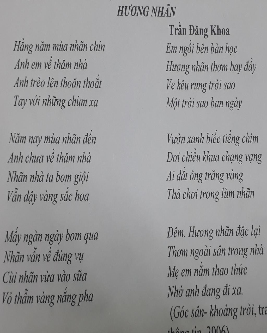 - Câu thơ trực tiếp nói đến "Hương nhãn": "Hương nhãn thơm bay đầy", "Đêm. Hương nhãn đặc lại/ Thơm ngoài sân trong nhà"