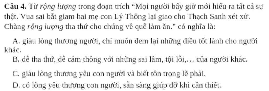 Câu 4: Từ rộng lượng trong đoạn trích 'Mọi người bấy giờ mới hiểu ra tất cả sự thật. Vua sai bắt giam hai mẹ con Lý Thông lại giao cho Thạch Sanh xét xử. Chàng rộng lượng tha thứ cho chúng về quê làm ăn.'' có nghĩa là: dễ tha thứ, dễ cảm thông với những sai lầm, tội lỗi,... của người khác