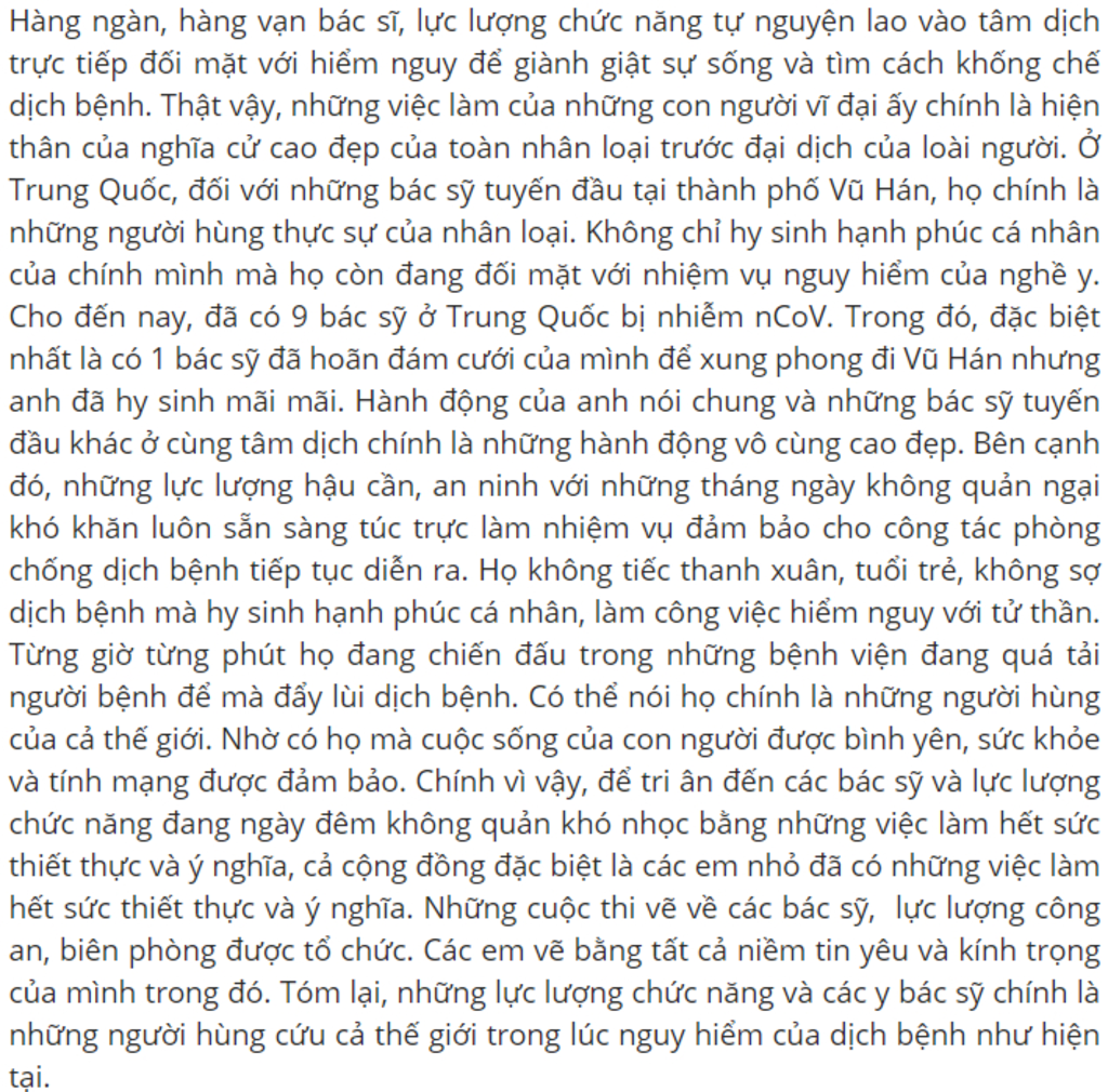 Hãy viết cảm nhận của mình thông qua những dòng tâm sự, cảm xúc, suy nghĩ về tình yêu, niềm tin của thiếu nhi đối với đất nước; ca ngợi những hình ảnh đẹp, lòng biết ơn, sự tri ân với các lực lượng xã hội đang thực hiện nhiệm vụ nơi tuyến đầu để bảo vệ sức khỏe của nhân dân, đem lại bình yên cho xã hội, đảm bảo an toàn để các em sớm trở lại trường. Ưu tiên những bài viết về người thật, việc thật trong chiến dịch phòng chống dịch bệnh Covid-19