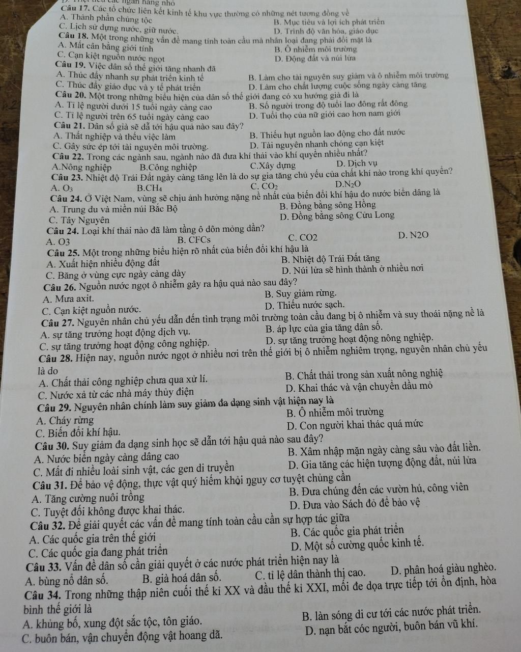 Câu 18. Một trong những vấn đề mang tính toàn cầu mà nhân loại đang phải đối mặt là