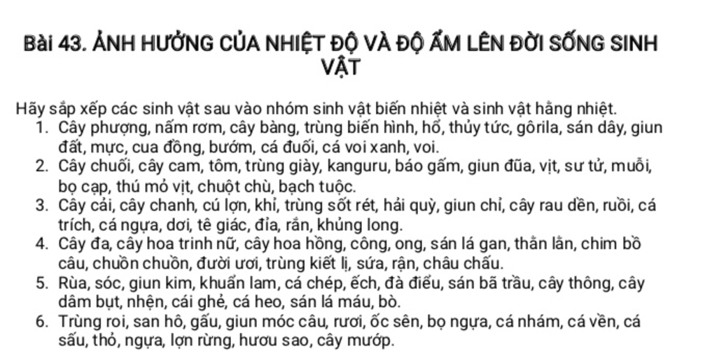 5/Sinh vật biến nhiệt: giun kim, khuẩn lam, cá chép, ếch, sán bã trầu, cây thông, cây dăm bụt, nhện, cái ghẻ, sán lá máu.