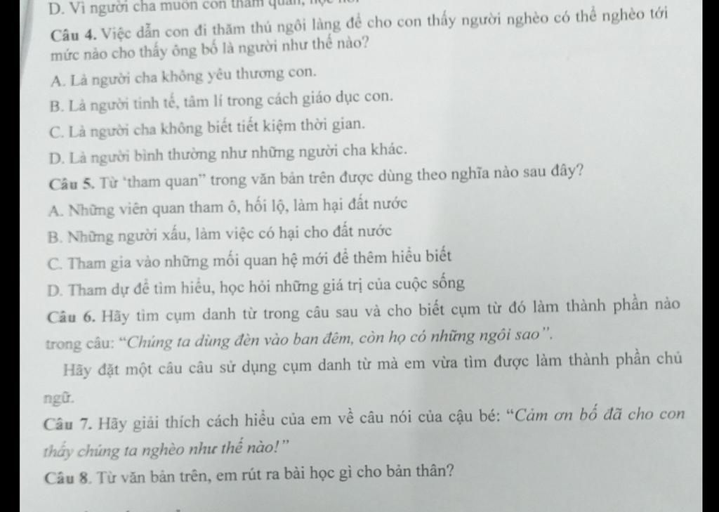 Câu 4 : B => Là người tinh tế,tâm lí trong cách giáo dục con.