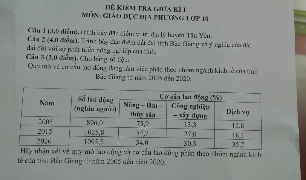 Câu 1 (3,0 điểm).Trình bày đặc điểm vị trí địa lý huyện Tân Yên.