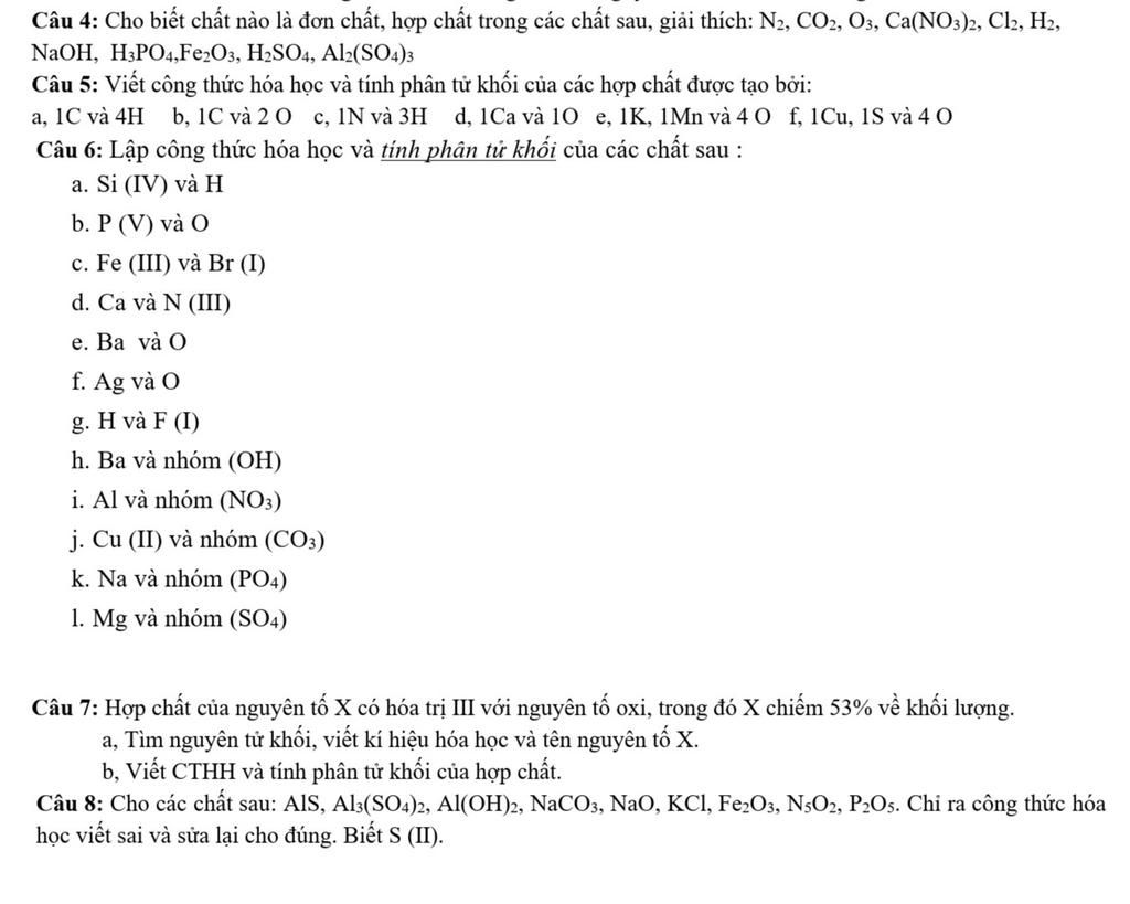 Câu 4: Cho biết chất nào là đơn chất, hợp chất trong các chất sau, giải thích: N2, CO2, O3, Ca(NO3)2, Cl2, H2,